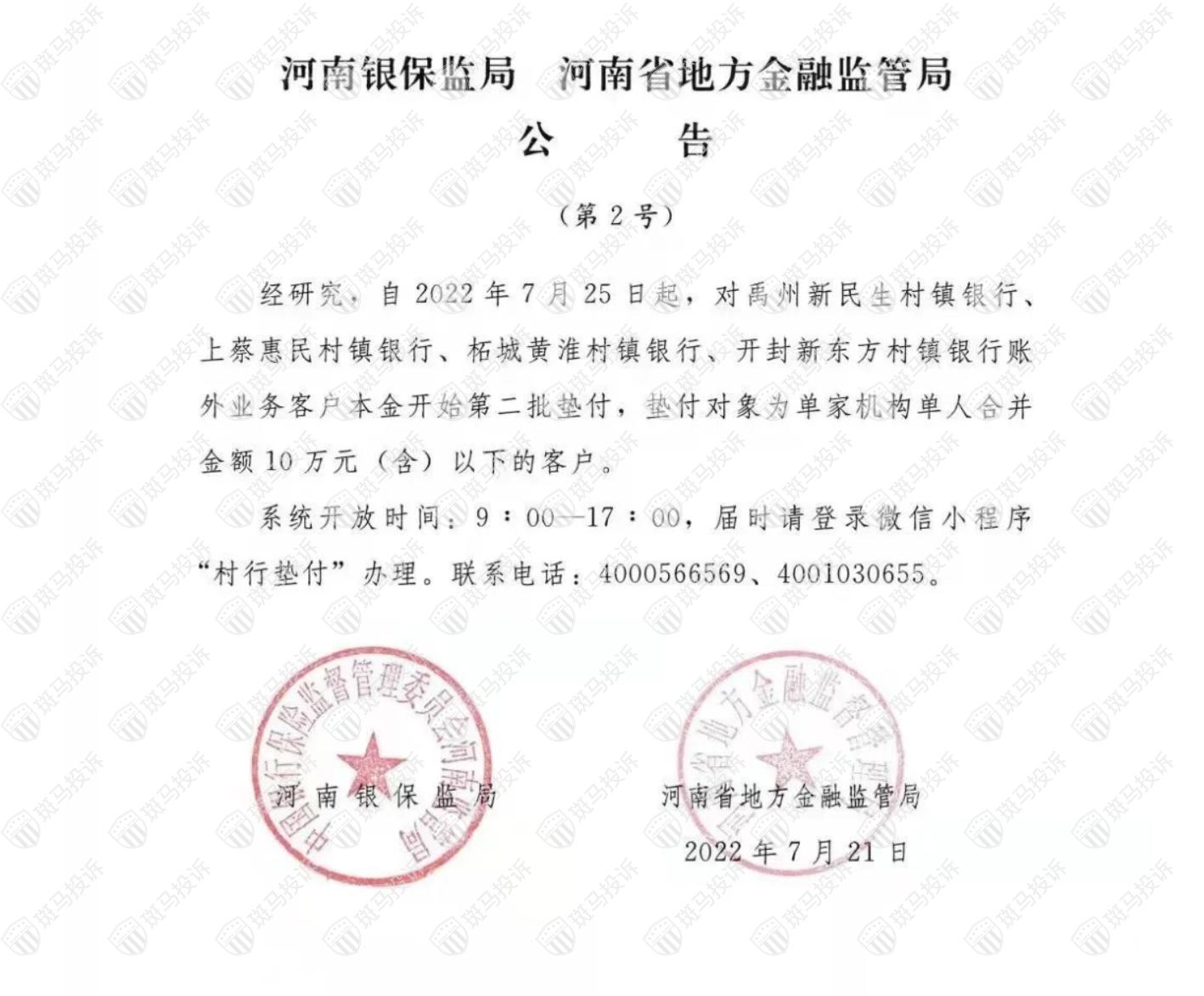 斑马投诉了解到河南村镇银行事件有了最新进展。7月21日,河南银保监局、河南省地方金融监管局发布公告(第2号)称,经研究,自2022年7月25日起,对禹州新民生村镇银行、上蔡惠民村镇银行、柘城黄淮村镇银行、开封新东方村镇银行账外业务客户本金开始第二批垫付,垫付对象为单家机构单人合并金额10万元(含)以下的客户。