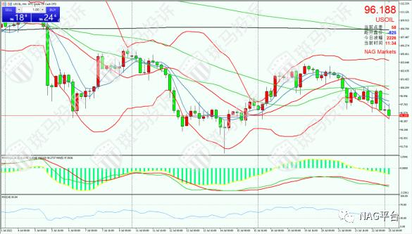 原油4小时图上看,MACD双线在零轴下方向下,阴柱势能增长,同时布林带开口向下扩大,油价目前在96位置震荡。技术面上看短线油价可能进一步下探布林带下轨位置。日内看支撑位在94点位附近,然后是90位置;阻力位在98美元/桶,然后是100位置。