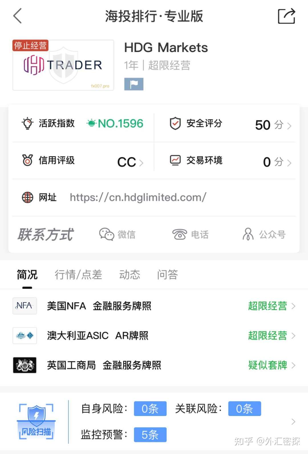 海投排行数据显示,HDG Markets成立于2022年,活跃指数1596,安全评分50分,信用评级CC,目前持有澳大利亚ASIC AR牌照,并没有外汇交易资质,在中国有两个MT4服务器,很明显是针对中国投资者的盘子。