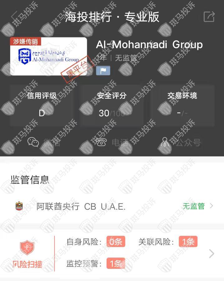 这家平台叫Al-Mohannadi Group,成立于2022年,目前无监管,没有外汇牌照,不能做外汇保证金交易,风险扫描显示2条风险,投资者资金安全无保障。