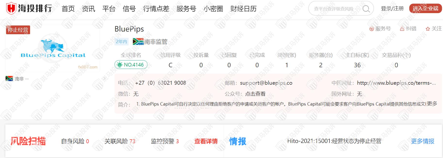 这家平台叫BluePips,成立于2020年,全球排名4146名,目前无监管,没有外汇牌照,不能做外汇保证金交易,投资者资金安全无保障。海投排行显示BluePips平台已停止经营,关联风险73条,监控预警3条。