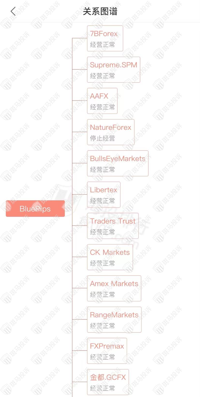 主白标关系显示BluePips平台和36家平台是一家公司,从他们的服务器地址,网站的模板来看,都可以看出来相似的地方。其中Nature Forex、Six Markets停止经营;稀万证券经营异常。