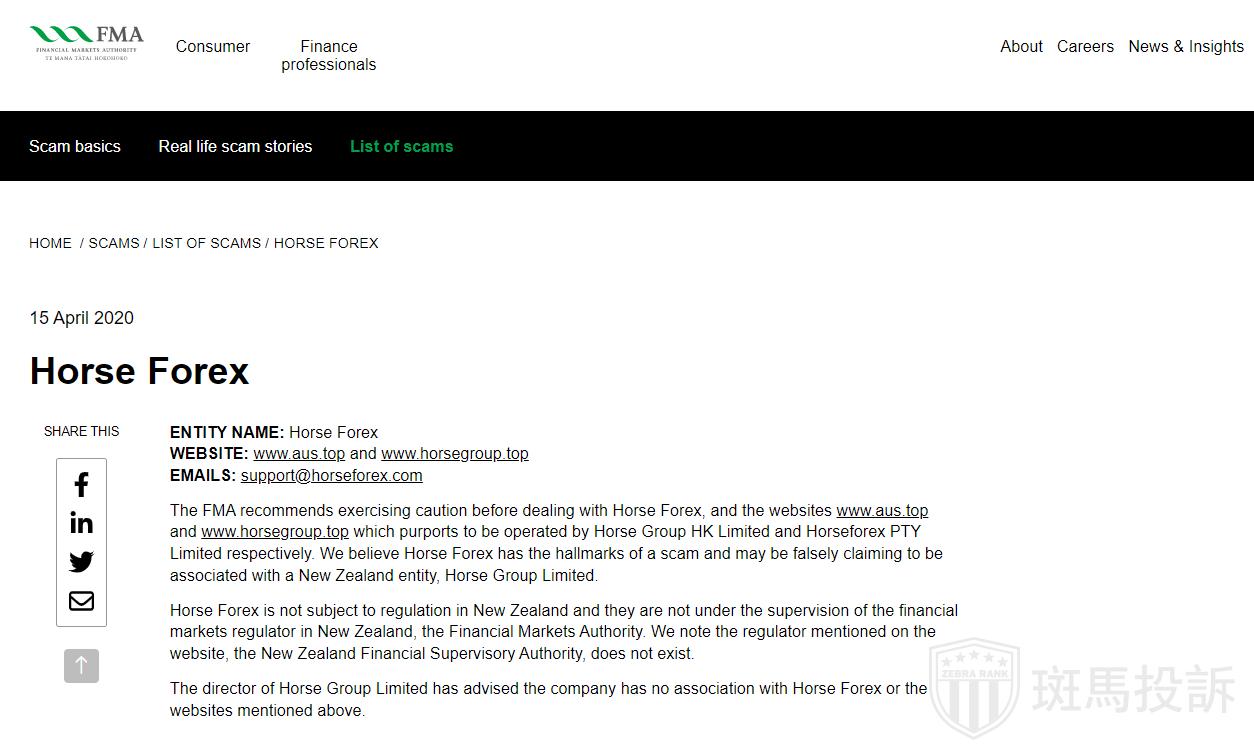 Horse Forex不受新西兰监管,也不受新西兰金融市场监管机构金融市场管理局的监管。FMA注意到网站上提到的监管机构新西兰金融监管局并不存在。