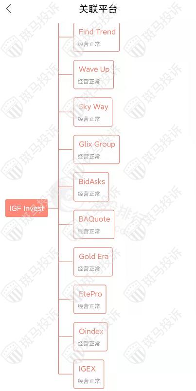 主白标关系显示,IGF Invest平台和20家平台相关联,目前这些平台经营正常。