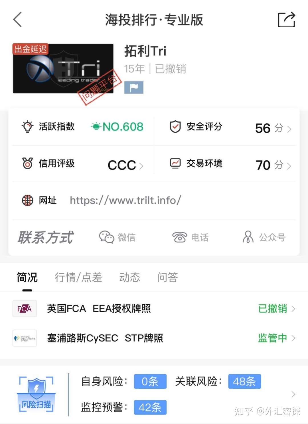 海投排行数据显示,拓利Tri国内活跃指数608名,安全评分56分,信用评级CCC,目前英国FCA授权的EEA已经过期不再使用,还持有塞浦路斯CySEC STP外汇牌照,看来是没有保证金支付牌照的费用了。