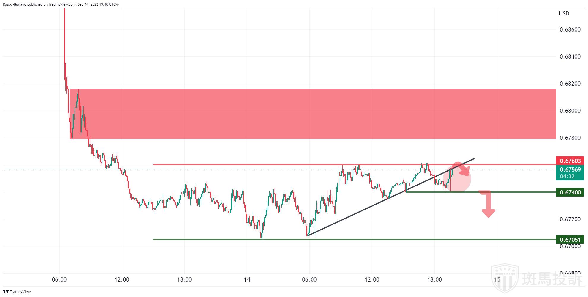 5分钟图显示,澳元/美元已进入盘整区间的关键水平,受美元上涨所驱动。若汇价跌破这一形态,处在趋势支撑0.6740下方,澳元/美元将再次测试 0.67。