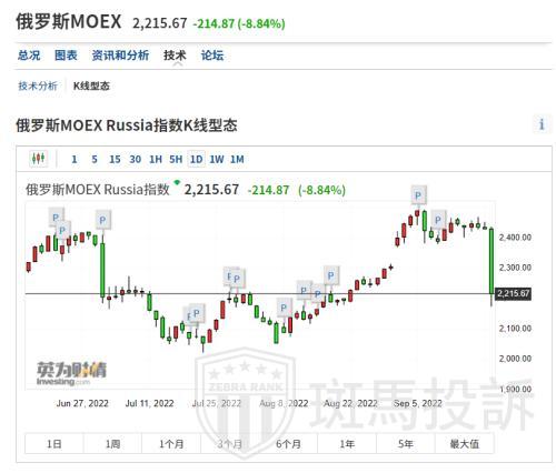 当地时间周二,俄罗斯股市大幅杀跌,俄罗斯MOEX指数一度跌超10%,创2月下旬来最大跌幅,俄罗斯RTS指数盘中跌幅也超过10%。不过,MOEX指数尾盘跌幅收窄至8.84%,收复了部分失地。
