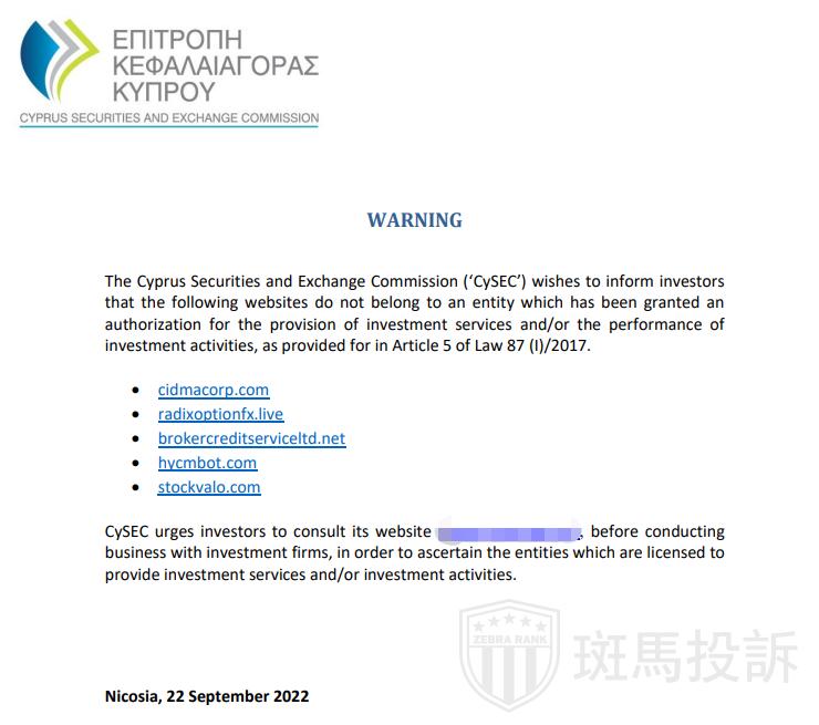 2022年早些时候,CySEC就冒充其代表的个人发出警告。监管机构已获悉,冒充CySEC官员或代表的人正在向投资者索取费用,以换取与CySEC监管下的公司有关的虚假赔偿要求的和解。