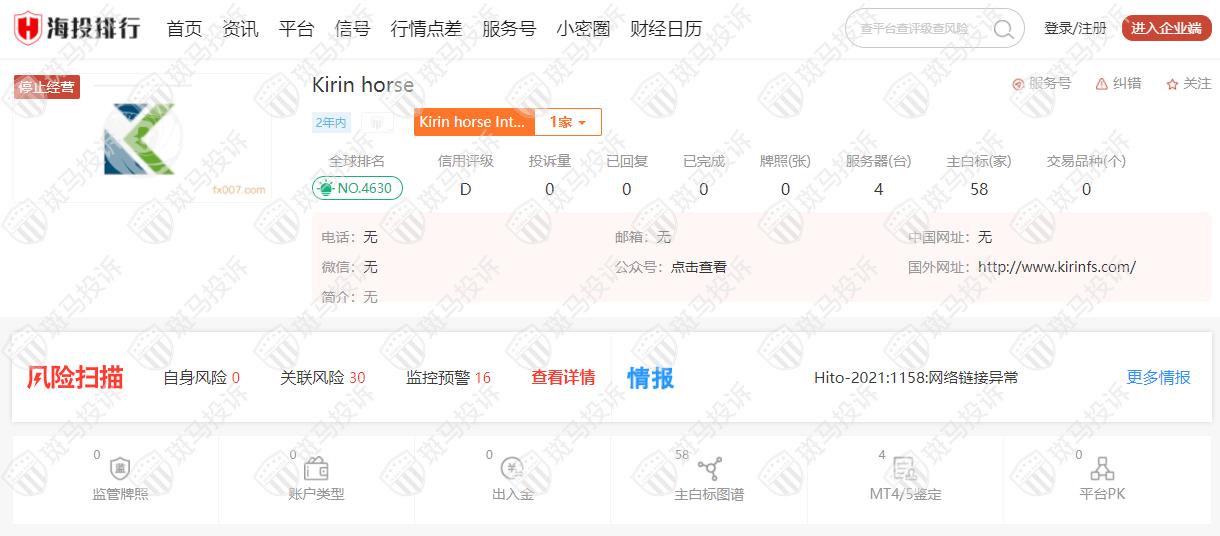 这家平台叫Kirin horse,成立于2020年,全球排名4630名,目前无监管,没有外汇牌照,不能做外汇保证金交易,风险扫描显示46条风险,投资者资金安全无保障。