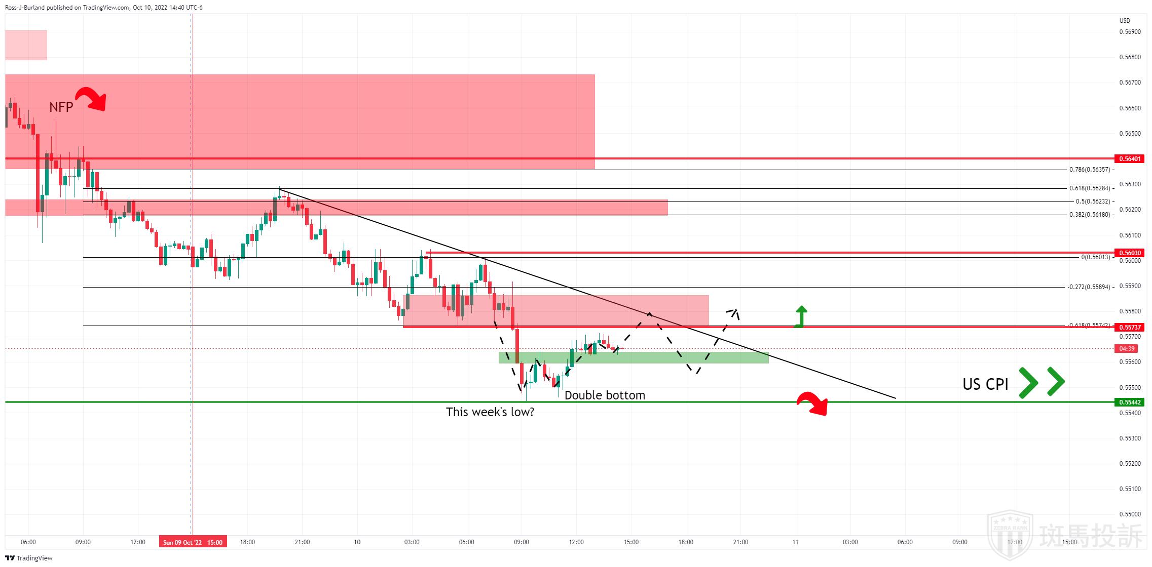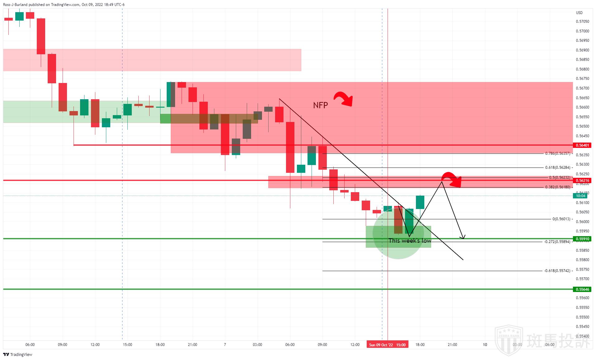 该价格正试图跌出继上周五非农公布后所构筑看跌趋势所在的阻力水平,多头需要突破0.5625水平,才能牢牢占据主导: