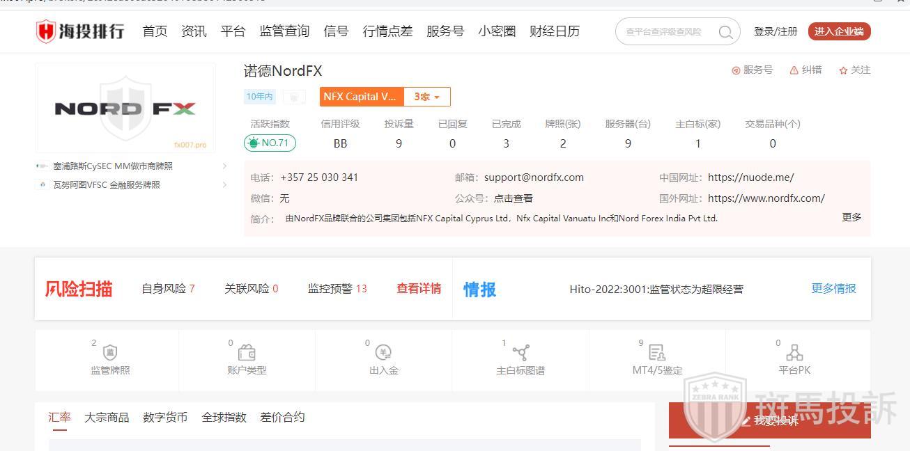 诺德NordFX成立于2013年,风险扫描显示197条风险,投资者资金安全无保障。