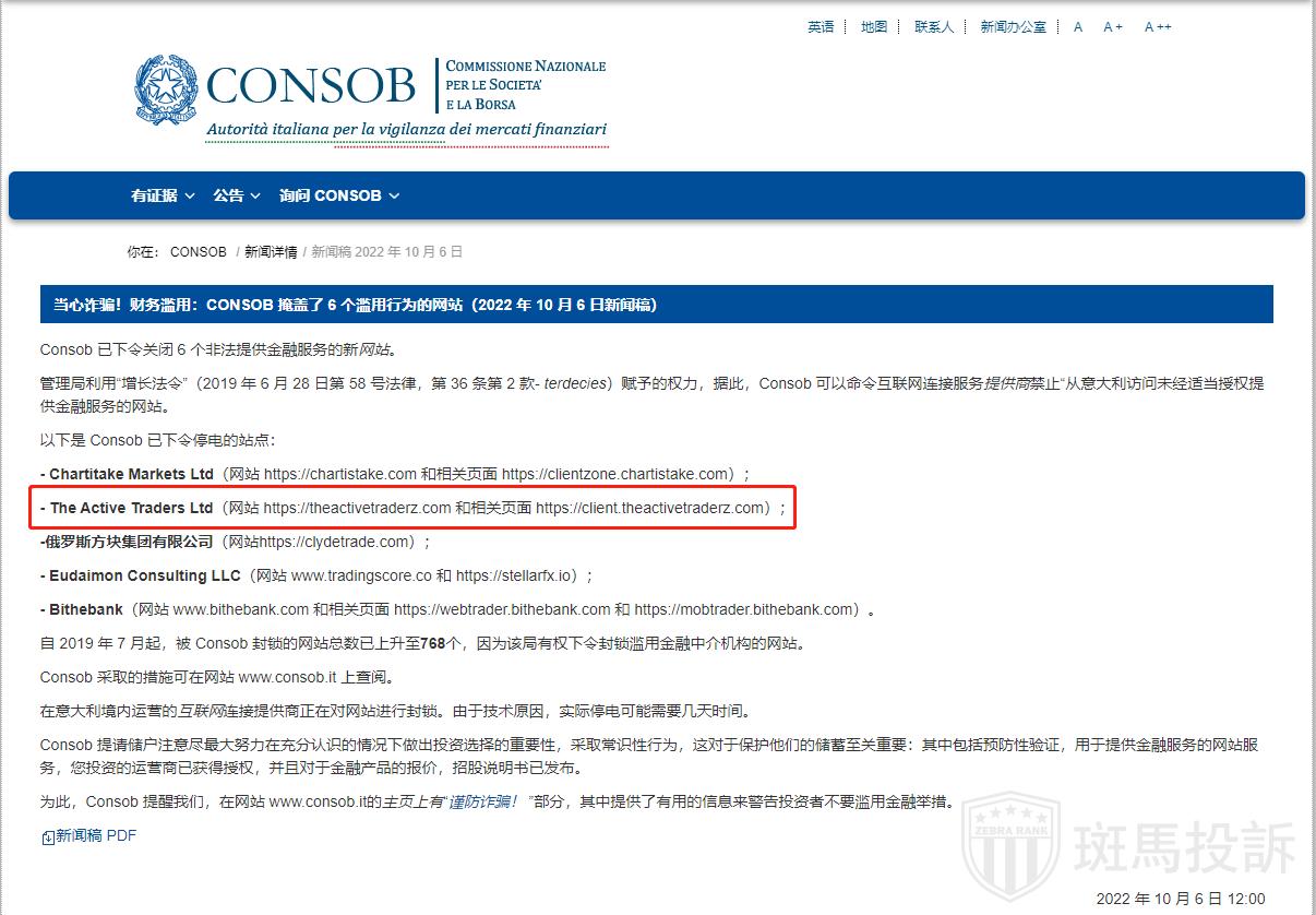 The Active Traders平台目前被意大利监管机构Consob列入警告名单,除此之外没有有效的金融体系监管,投资者投资资金有风险。投资需谨慎!