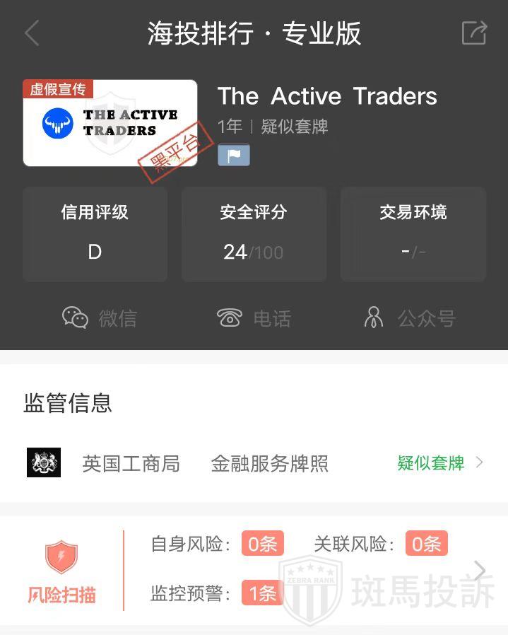 The Active Traders成立于2022年,活跃指数5252名,平台宣称有在英国工商局注册,经查询可能存在套牌嫌疑,目前正处于意大利监管机构Consob的警告名单中,风险扫描显示1条风险,投资者资金安全无保障。