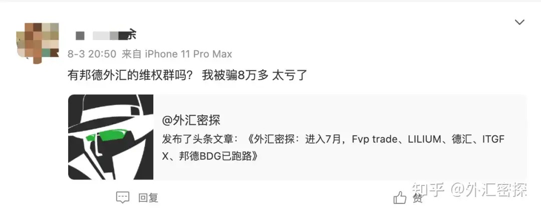 外汇密探曾经分享过一篇文章:被骗后,可以进外汇维权群吗?详细介绍了邦德外汇BDG在跑路的时候,有诈骗团队利用维权回本信息,进行诈骗的套路。Fvp trade、LILIUM百合外汇、德汇、ITGFX、邦德外汇BDG 这五家外汇资金盘跑路的影响还在继续,成千上万的人正在寻找拿回资金的途径。很多人问外汇密探:有XX外汇的维权群吗?我被骗了很多,想一起维权。
