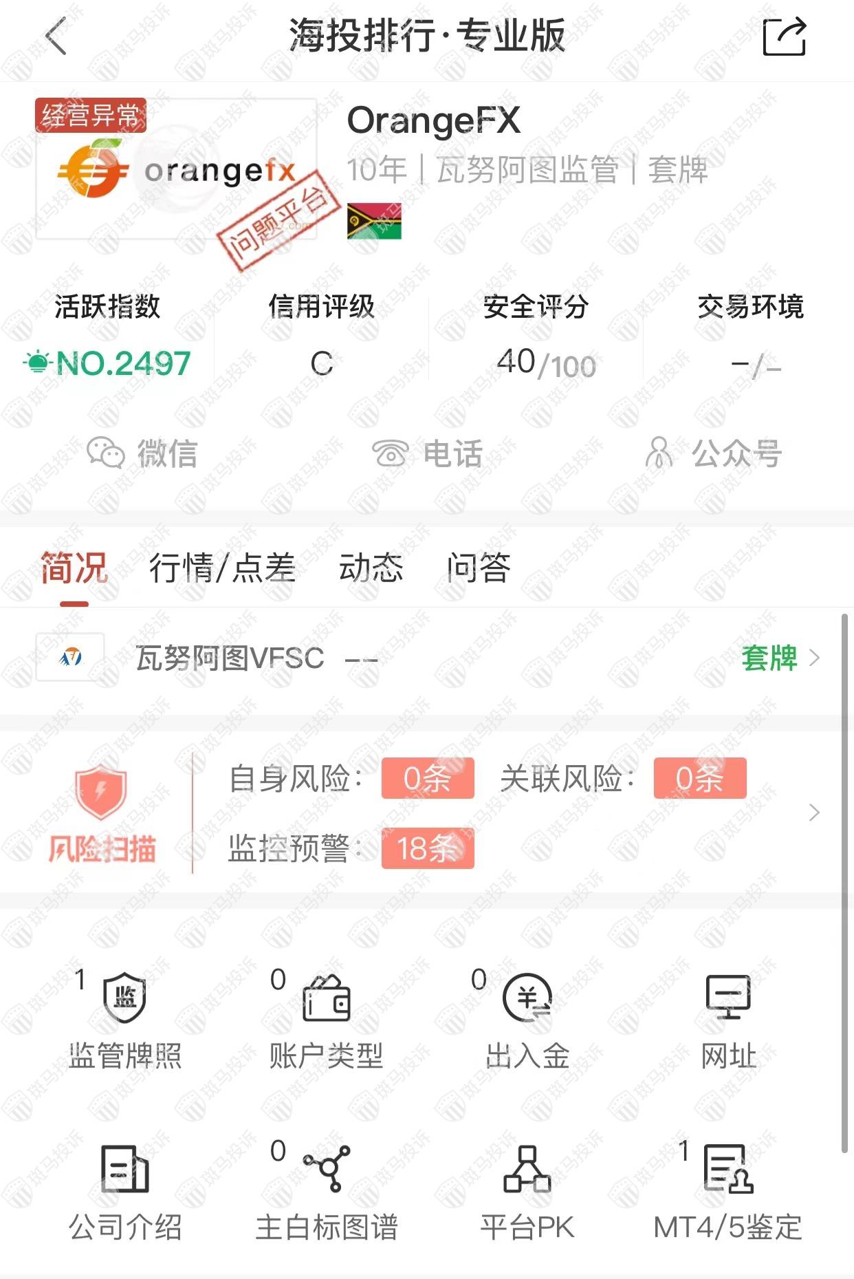 据海投排行资料显示,OrangeFX平台成立于2012X年,全球排名2497名,目前无监管,没有外汇牌照,不能做外汇保证金交易,风险扫描显示18条风险,投资者资金安全无保障。