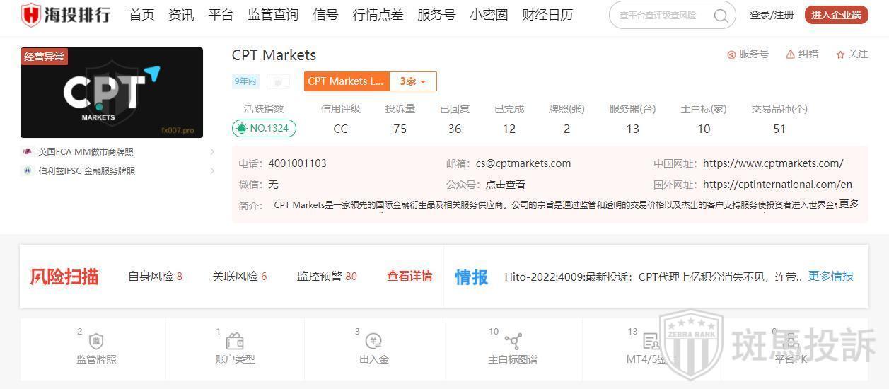 CPT Markets成立于2012年,风险扫描显示88条风险,投资者资金安全无保障。