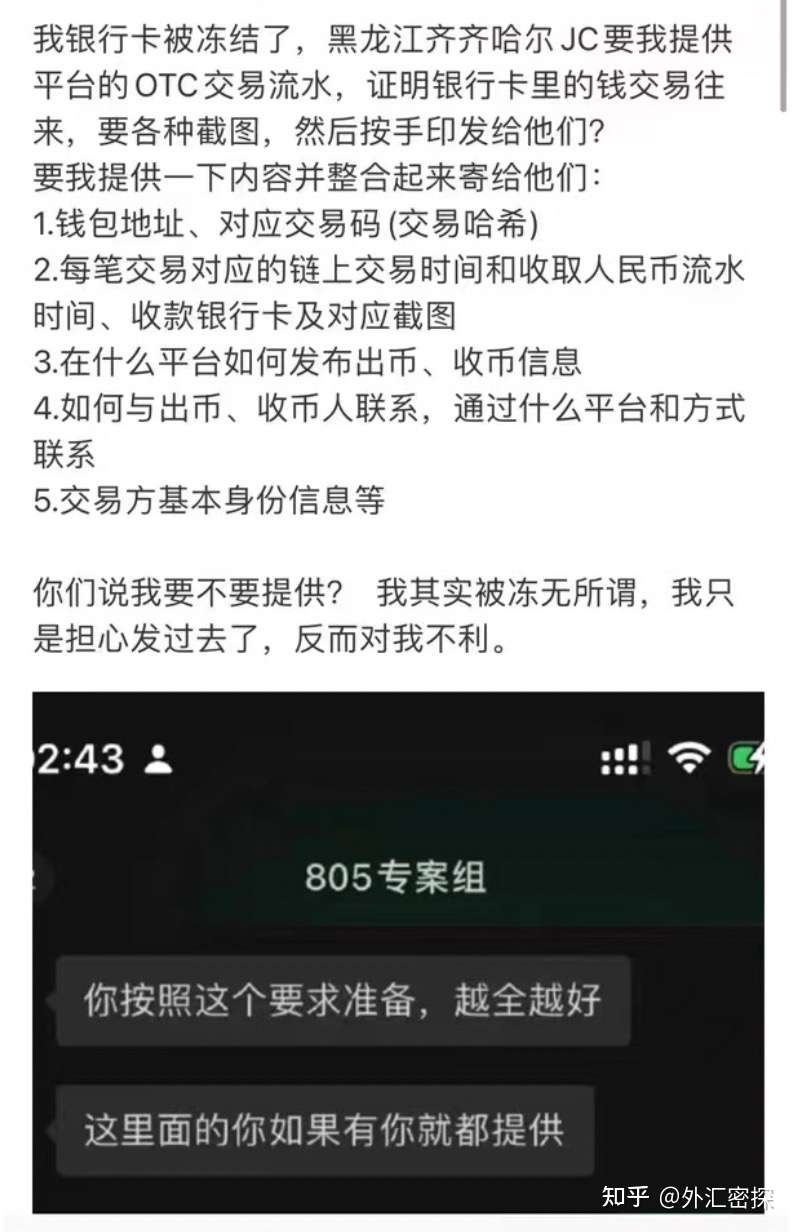 最近有一个大号资金被冻结,黑龙江齐齐哈尔市JC要他提供平台OTC交易流水,证明银行卡里的钱交易往来,要各种截图,同时按手印发给JC。由于事先没有此类经验,在线咨询是否需要配合JC提供完全的交易记录,也担心在提供完整的交易记录后,会有其他的判定,进而影响正常生活。