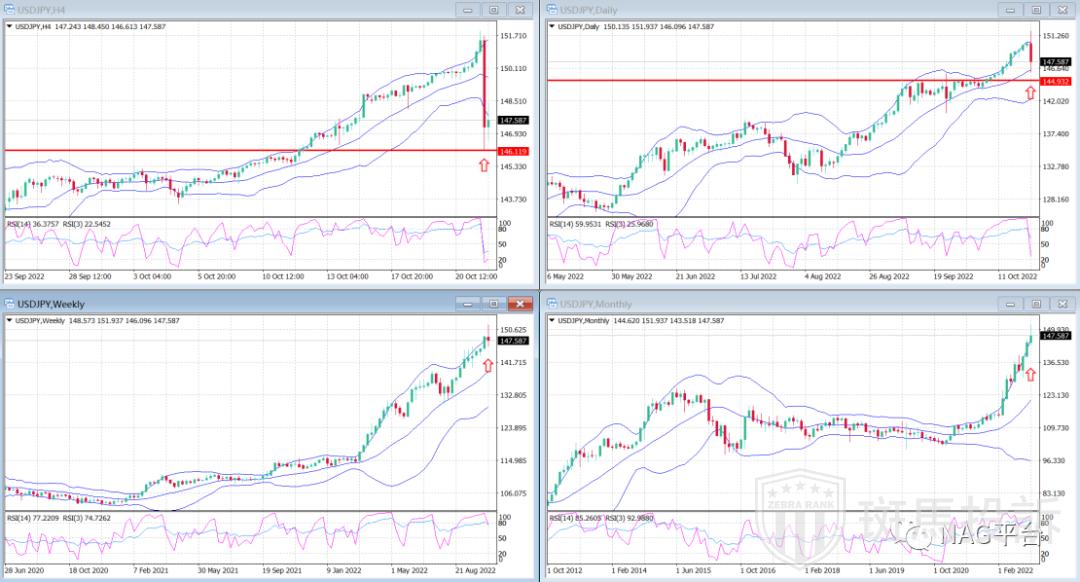 美元兑日元USDJPY(左上4小时线、右上日线、左下周线、右下月线)