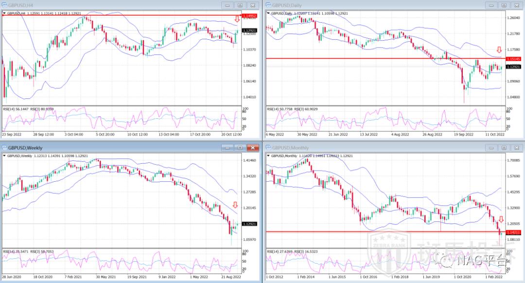 英镑兑美元GBPUSD(左上4小时线、右上日线、左下周线、右下月线)