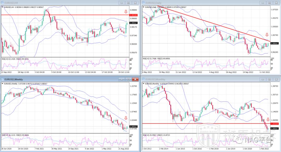 欧元兑美元EURUSD(左上4小时线、右上日线、左下周线、右下月线)