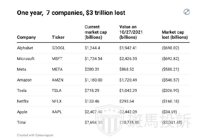 最新数据显示,在过去的一年(始于2021年10月27日),美国7家最主要的大型科技公司的总市值蒸发了3万亿美元,令人震惊。这其中,有6支股票损失惨重。苹果公司的表现略好,市值仅损失约350亿美元。