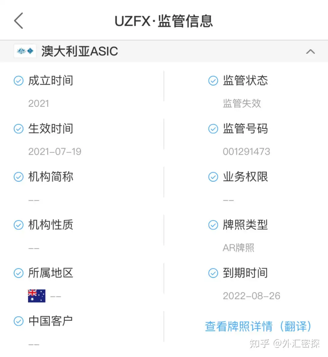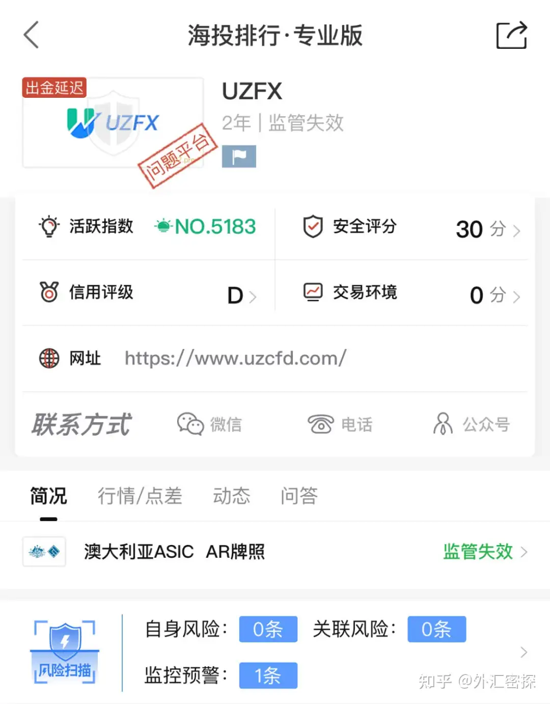 海投排行数据显示,UZFX成立于2022年,国内活跃指数第5183名,安全评分30分,信用评级D,官方宣称持有澳大利亚ASIC 的AR牌照,经外汇密探查询,AR牌照是没有外汇资质的,同时,这张AR牌照,在ASIC登记的时间已经过去,属于监管失效的黑平台。