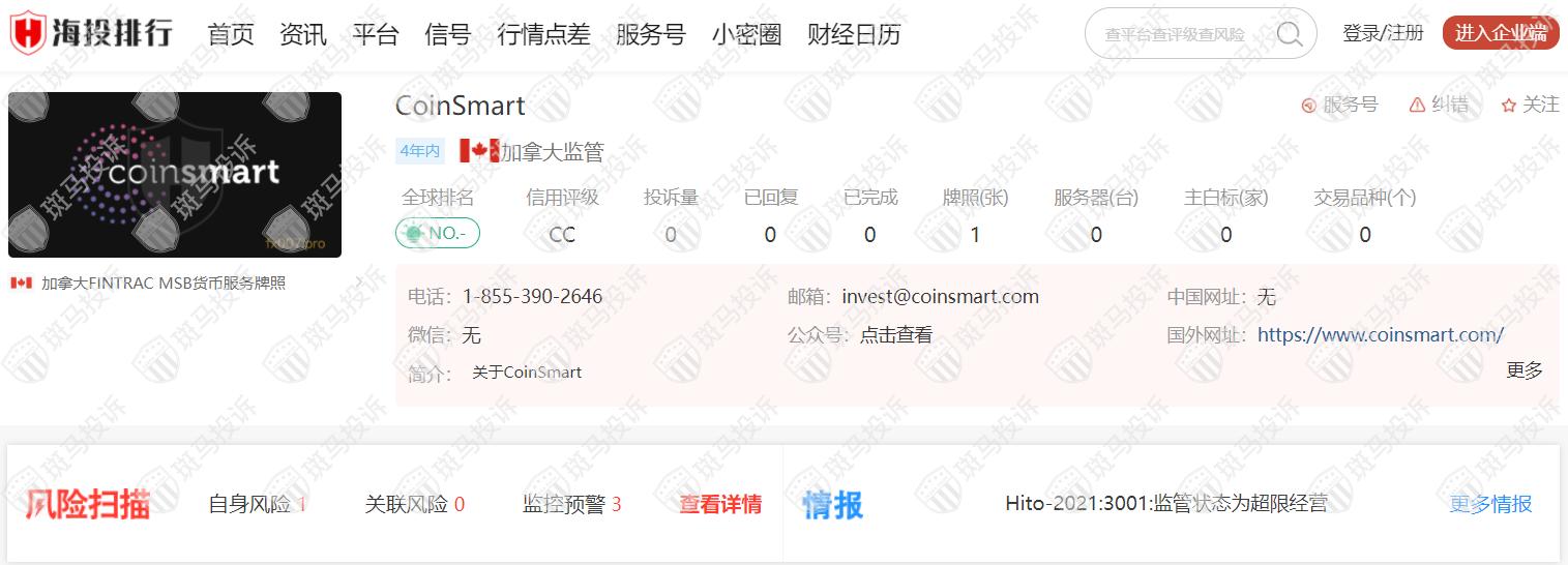 CoinSmart成立于2018年,目前由加拿大FINTRAC监管,但属于超限经营,风险扫描显示3条风险,投资者投资需谨慎。