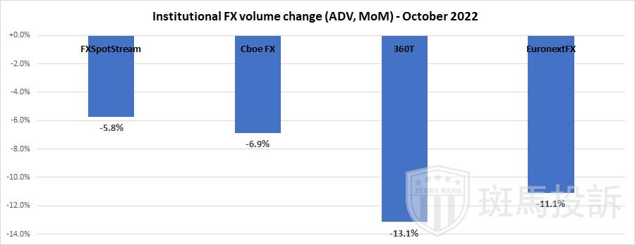 总体而言,领先机构外汇ECN-Cboe FX、EuronextFX、FXSpotStream和Deutsche Borse的360T——10月份交易量平均环比下降9%,所有上述公司的环比下降至少5%。