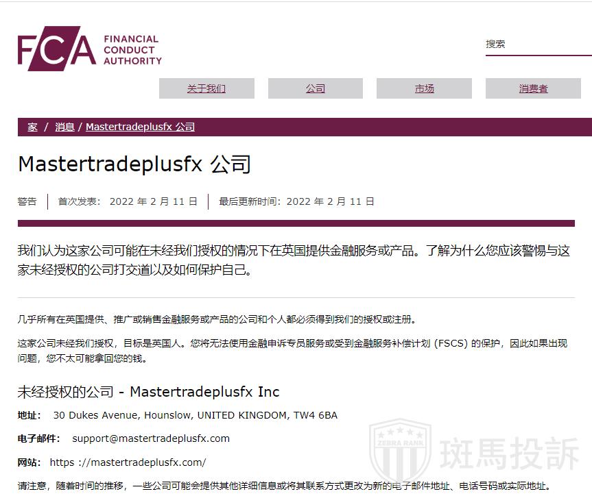 Mastertradeplusfx平台自称受到FCA、KNF和CMB在内的全球最大监管机构的监管,获得金融部门行为监管局(FSCA)的许可,并提供许可号为:08938176,据查询,该许可号查无机构,根据平台名称查询并未受到FCA、KNF和CMB的监管,并且该平台在未经英国FCA授权的情况下在英国提供金融服务或产品,被英国FCA列入警告名单,所以如果您的投资出现了问题,您将无法使用金融申诉专员服务或受到金融服务补偿计划(FSCS)的保护,投资需谨慎!