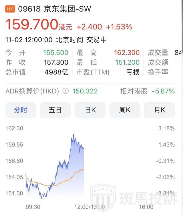 截至发稿,京东报159.7港元/股,涨幅1.53%,总市值4988亿港元。