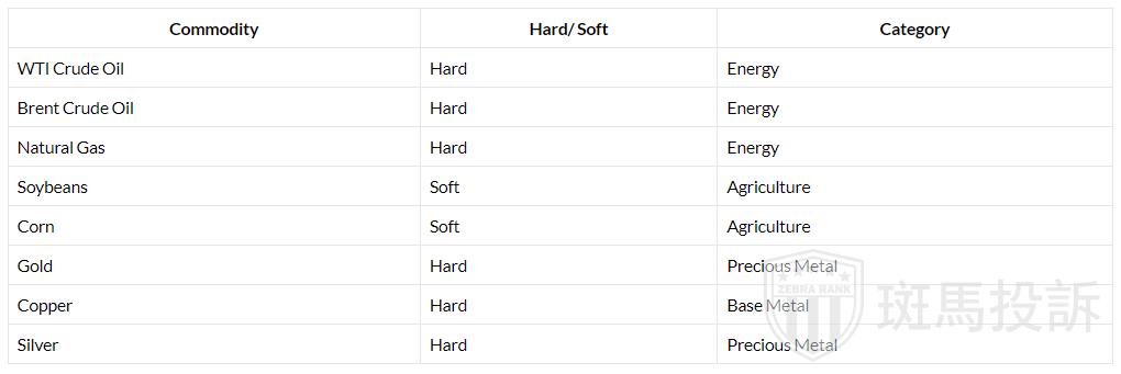 商品有两种关键类型:硬商品和软商品。硬商品是自然产生的资源,无需干预即可创造但需要提取。硬商品的例子包括石油、金属和天然气。软商品是需要人工干预才能生产的商品。软商品的例子包括谷物、木材和牲畜。下表列出了最受欢迎的交易商品,无论是硬商品还是软商品,以及它们所属的类别。