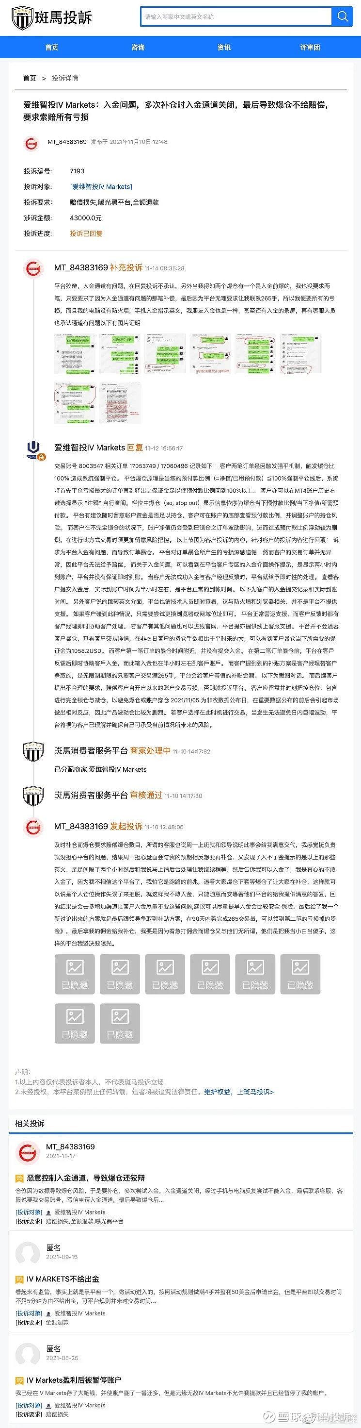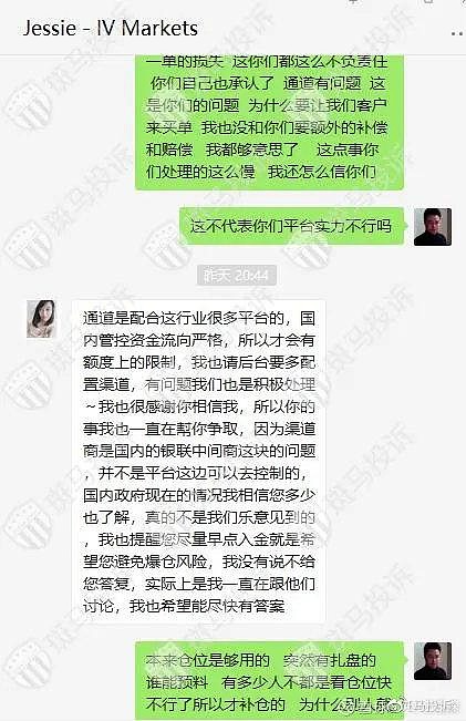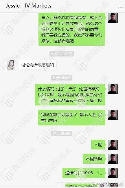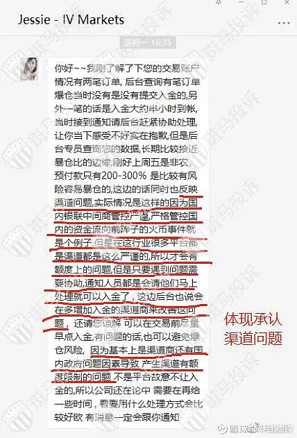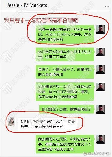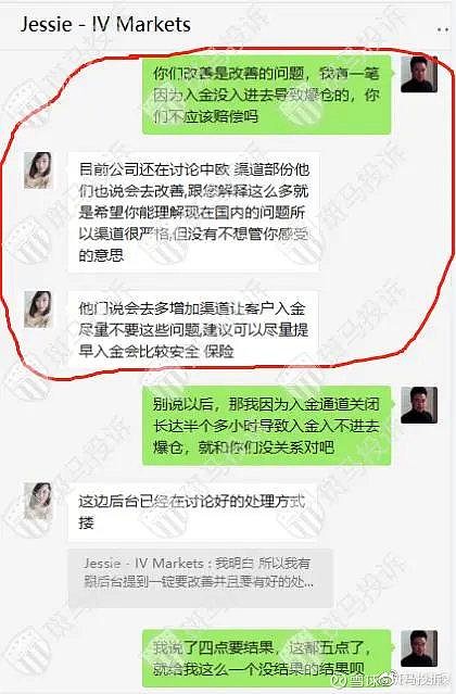 据用户反馈:在爱维智投IVMarkets交易,仓位因为数据导致爆仓风险,于是要补仓,多次尝试入金,入金通道关闭,经过手机与电脑反复尝试不能入金,最后联系客服,客服说要我交易账号,写信申请入金通道,最后导致爆仓后通道打开入金成功,时长一个小时左右。爱维智投IVMarkets回复说入金两个小时内到账,半小时内让我入金了,这纯属于睁眼说瞎话,所谓两小时内入金成功那是建立在网站通道打开的情况下,入金的钱已经划走,可是当时操作时是不能提交申请,只要到填完信息一提交就变成英文,当时我没有录视频,但是我朋友在我之前补仓,她有录视频,所以平台所说的正常入金两小时到账这样的话纯属于狡辩,视频这样的操作结果是否属于正常,这只要是一个有脑子的人都能看出来吧。另外爱维智投IVMarkets还说我是在半小时内入金成功的,净扯淡,所谓的半小时是因为我自己尝试多次都无法正常入金,通道关闭,实在没办法才找的客服,之前自己入金就不算是入金的时间了吗?以下有我与客服的对话。再有如果爱维智投IVMarkets入金通道没问题,那就是看我账户属于盈利,账号被监测发现需要补仓恶意关闭通道,否则为什么当我联系客服后,客服要了我的账号还和我说写信申请我入金,等个别的大单子爆仓后入金通道正常呢,甚至还说给我补偿,只不过补偿条件是让我交易265手,虽然说这是又一个坑让我跳。但是也证实了他们是因为入金通道有问题才给出了要求我操作的补偿给我方案。现在又说他们入金通道没问题,这爱维智投IVMarkets完全是挂羊头卖狗肉,自己打自己嘴巴子。以下有图片从开始打不开通道客服回我之后也没和我提过让我换浏览器和关闭防火墙而是她说写信等通知后告诉我开通了我用同样的浏览器入金成功的。爱维智投IVMarkets回复:交易账号 8003547 相关订单 17053749 / 17060496 记录如下:客户两笔订单是因触发强平机制,触发爆仓比 100% 造成系统强制平仓。平台爆仓原理是当您的预付款比例(=净值/已用预付款)≦100%强制平仓线后,系统将首先平仓亏损最大的订单直到释出之保证金足以使预付款比例回到100%以上。 客户亦可以在MT4账户历史右键选择显示 "注释" 自行查阅,栏位中爆仓(so, stop out)显示信息依序为爆仓当下预付款比例/当下净值/所需预付款。平台有建议随时留意帐户资金是否足以持仓,客户可在账户的底部查看预付款比例,并调整账户的持仓风险。而客户在不完全锁仓的状况下,账户净值仍会受到已锁仓之订单波动影响,进而造成预付款比例浮动较为剧烈,在进行此方式交易时须更加留意风险把控。 以上节图为客户投诉的内容,针对客户的投诉内容进行回覆:诉求为平台入金有问题,而导致订单暴仓。平台对订单暴仓所产生的亏损深感遗憾,然而客户的交易订单并无异常,因此平台无法给予赔偿。而关于入金问题,可以看到在平台客户专区的入金介面操作提示,是显示两小时内到账户,平台并没有保证即时到账。当客户无法成功入金与客户经理反馈时,平台就给予即时性的处理。查看客户提交入金后,实际到账户时间为半小时左右,是平台正常的到帐时间。以下为客户的入金提交记录和实际到账时间。 另外客户说的跳转英文介面,平台也请技术人员即时查看,这与防火墙和浏览器相关,并不是平台不提供支援。如果客户碰到此种情况,只需要尝试更换浏览器或网域位址即可。平台正常营运支援,而客户反馈时都有客户经理即时协助客户处理。若客户有其他问题也可以进线官网,平台提亦提供线上客服支援。平台并不会逼著客户暴仓,查看客户交易详情,在非农日客户的持仓手数相比于平时来的大,可以看到客户暴仓当下所需要的保证金为1058.2USD。而客户第一笔订单的暴仓时间附近,并没有提交入金。在第二笔订单暴仓前,平台在客戶反馈后即时协助客戶入金,而此笔入金也在半小时左右到客戶账戶。而客户提到到的补贴方案是客户经理替客户争取的,是无限制期限的只要客户交易满265手,平台会给客户等值的补贴金额。以下为截图对话。而后续客户提出不合理的要求,赔偿客户自开户以来的账户交易亏损,否则就投诉平台。客户应留意并时刻把控仓位,包含进行完全锁仓与减仓,以避免爆仓或账户穿仓 2021/11/05 为非农数据公布日,在重要数据公布的前后会引起市场做出相对反应,因此产品波动会比较为剧烈。若客户选择在此时机进行交易,当发生无法避免日内巨幅波动,平台将视为客户已理解并确保自己可承受当前情况所带来的风险。用户回复:爱维智投IVMarkets狡辩,入金通道有问题,在回复投诉不承认,另外当我得知两个爆仓有一个是入金前爆的,我也没要求两笔,只要要求了因为入金通道有问题的那笔补偿,最后因为爱维智投IVMarkets无理要求让我联系265手,所以我便要所有的亏损,而且我的电脑没有防火墙,手机入金指示英文,我朋友入金也是一样,甚至还有入金的录屏,再有客服人员也承认通道有问题以下有图片证明。