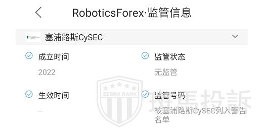 RoboticsForex平台官网显示,RoboticsForex平台受澳大利亚ASIC、迪拜DFSA、南非FSCA、英国FCA、塞浦路斯CySEC(牌照号441/33)、国际金融服务中心IFSC(30/197/FD/06)和毛里求斯FSC(投资交易商许可证号:D2230881749)七个金融监管机构的监管,但是据平台名称和提供的许可号等在对应的机构查询显示是查无信息,并且RoboticsForex平台还被塞浦路斯CySEC列入了警告名单,除此之外该平台没有有效的监管,投资具有很大的风险。