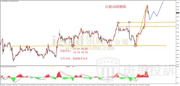 从图中白银1小时周期图看,白银底部做了箱体底部形态后形成了多头趋势,目前行情延续多头趋势不变。周四白银价格在箱体颈线位大支撑价格18.80大反弹后,价格一直强势单边拉升上涨,走势非常流畅,k线力度也非常强势多头继续延续上涨趋势不变。周五价格突破了近期高点20.10,目前前期压力位置变成了后期支撑位置,价格回踩支撑位置后可以低吸操作多单。结合指标MACD看,快慢线0轴下方金叉信号,并且上穿了0轴,表示空翻多信号开始。策略上投资者逢低做多思路为主。