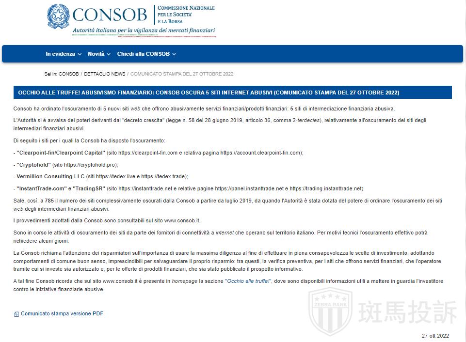 10月27日,Consob已下令封锁5个非法网站,被封锁的投资网站数量达785个。