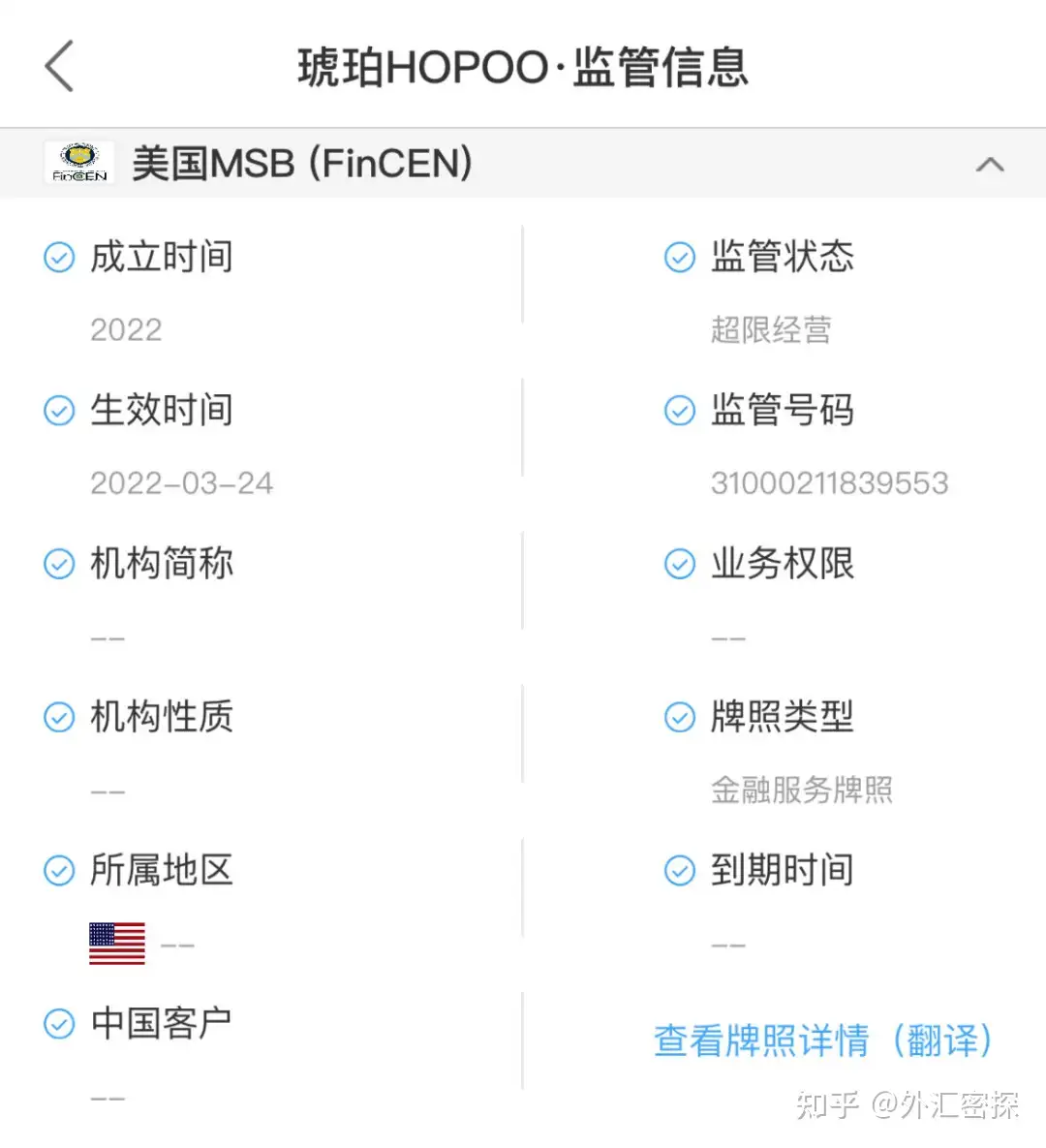 海投排行数据显示,HOPOO琥珀成立于2020年,国内活跃指数0,安全评分50分,信用评级CC,目前持有美国MSB数字金融服务牌照,该牌照仅限于在美国开展数字货币非交易服务,并不能开设交易所,以及接受客户进行交易,更不能接受中国客户开户。