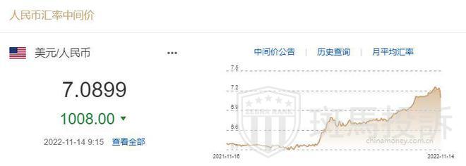 11月14日,人民币兑美元中间价调升1008点至7.0899,创2022年9月27日以来最高,调升幅度创2005年7月22日以来最大。前一交易日中间价报7.1907,在岸人民币16:30收盘价报7.1106,23:30夜盘收报7.0935。