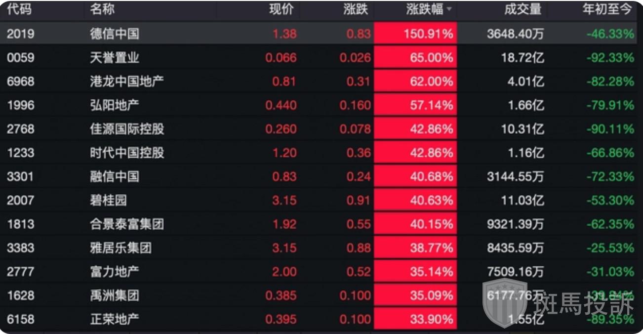 港股表现更加兴奋,内房股亦普遍高开,恒生地产建筑业指数以7.97%的涨幅居于各指数之首,89只成分股无一下跌,更16只地产股涨幅超30%。其中,德信中国涨幅为最大,超150%,天誉置业、港龙中国涨幅超60%,碧桂园、合景泰富涨幅超40%,雅居乐集团、富力地产、正荣地产也分别录得超30%的涨幅。