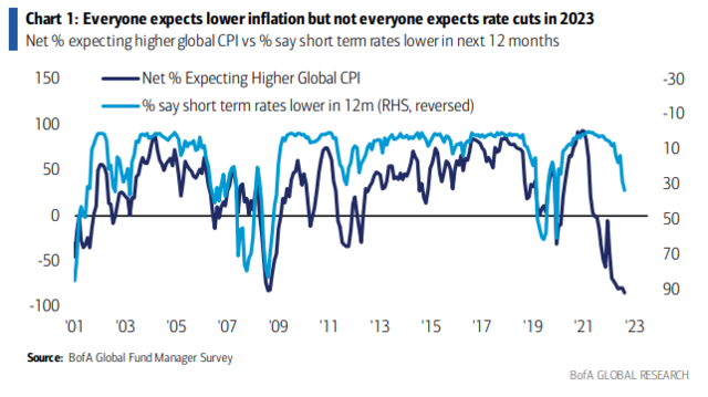 正如高盛强调2023年美国通胀将快速下行,美国银行对基金经理的最新调查也显示,受访者预计全球通胀将于明年开始降温。但是他们并不认为美联储会跟随通胀缓解同步降息,并且对滞胀的担忧已经涌上心头。