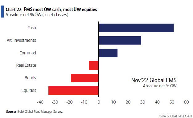 并且鉴于市场情绪依旧“极度悲观”,投资者对衰退的预期处于2020年4月以来的最高点,Hartnett认为应在标普500指数涨超4100点时将其卖出(较昨日收盘价高出近3%)。调查结果还显示,受悲观预期的影响,基金经理大多增持现金,减持股票。