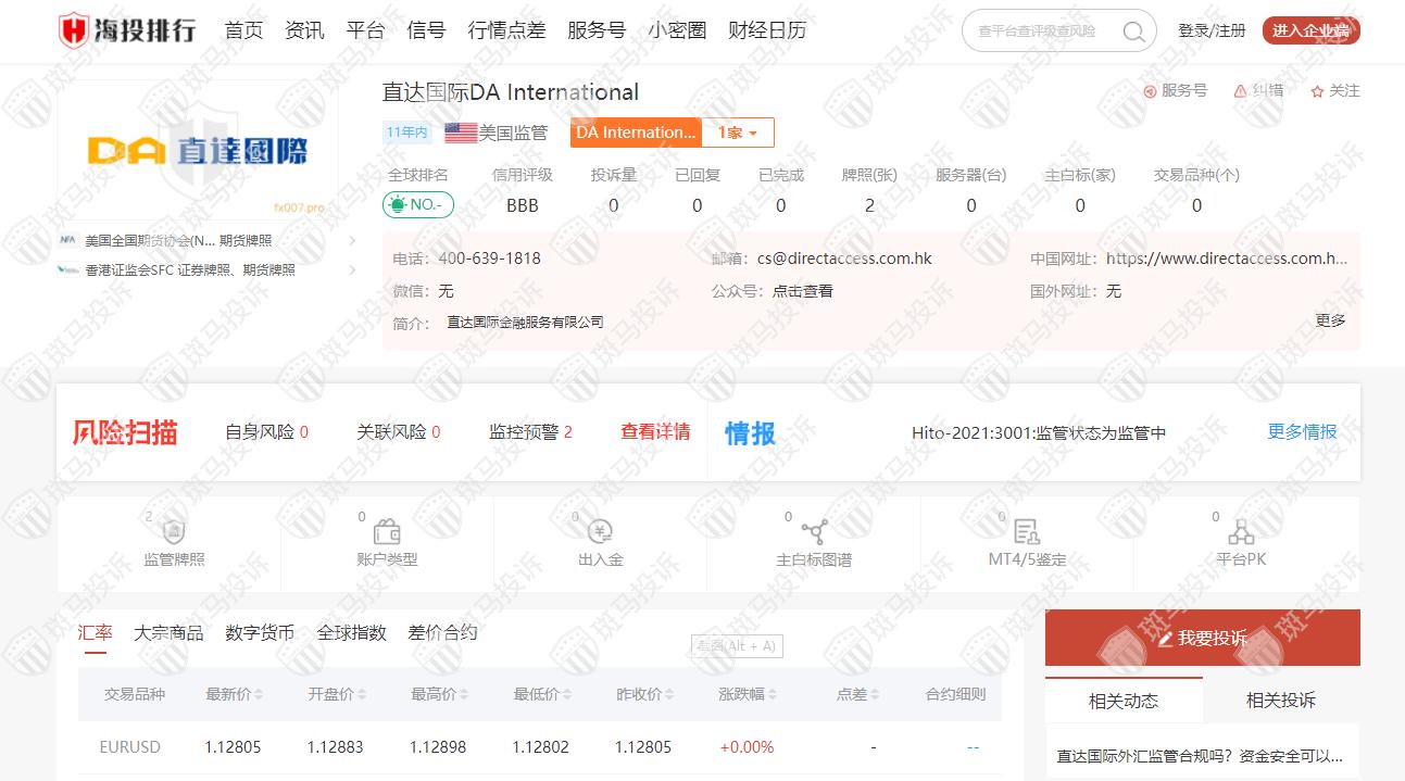 今天要帮大家测评一家平台,这家平台叫DA International直达国际,成立于2011年,信用评级为BBB,目前有2个监管,分别是香港SFC和美国NFA的监管,风险扫描显示2条风险,投资者资金安全无保障。