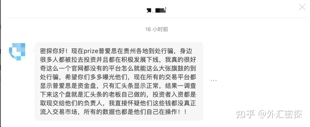 有用户反馈:密探你好!现在“prize普爱思”在贵州各地到处行骗,身边很多人都被拉去投资并且都在积极发展下线,我真的很好奇这么一个官网都没有的平台怎么就能这么大张旗鼓的到处行骗,希望你们多多曝光他们,现在所有的交易平台都显示“普爱思”是资金盘,只有“汇头条”显示正常,结果一调查下来这个盘就是“汇头条”的老板自己做的,投资者入资都是取现交给他们的负责人,我直接怀疑他们这些钱都没真正流入交易市场,所有的数据也都是他们自己在操作!!