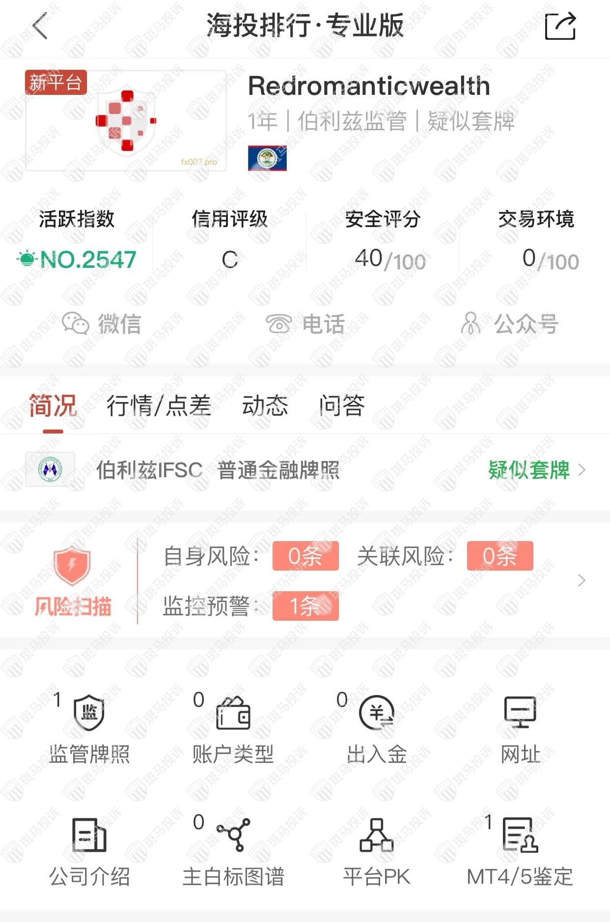 这家平台叫Redromanticwealth,成立于2021年,全球排名2547名,目前无监管,但是没有外汇牌照,不能做外汇保证金交易,风险扫描显示1条风险,投资者资金安全无保障。