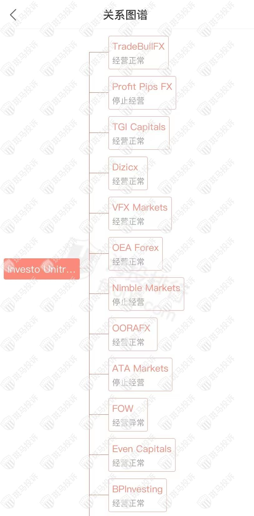 主白标关系显示Investo Unitrade平台和135家平台是一家公司,从他们的服务器地址,网站的模板来看,都可以看出来相似的地方。其中FOW经营异常;Profit Pips FX、Nimble Markets、ATA Markets停止经营。