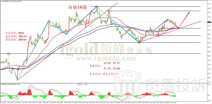 从上图白银1小时周期图来看,白银目前已经在20.57附近再次获得企稳,并逐步拐头向上,且自从11月21日以来,白银就走出了一段高点和低点逐渐抬高的走势,且其预计的上升趋势线也已经成型,如上图所示,预计白银后市上涨的概率较大。从均线上来看,白银目前也已经站上了1小时MA60均线以及EMA144均线,这表明白银目前处于偏多区域。上图中画出了白银目前的2条水平压力线以及2条水平支撑线,预计白银日内首次到达图中的支撑位时能够获得企稳并再次上涨,上图中还画出了白银后期的预计走势图,预计日内操作可尝试在上图中的第一支撑位附近轻仓做多。