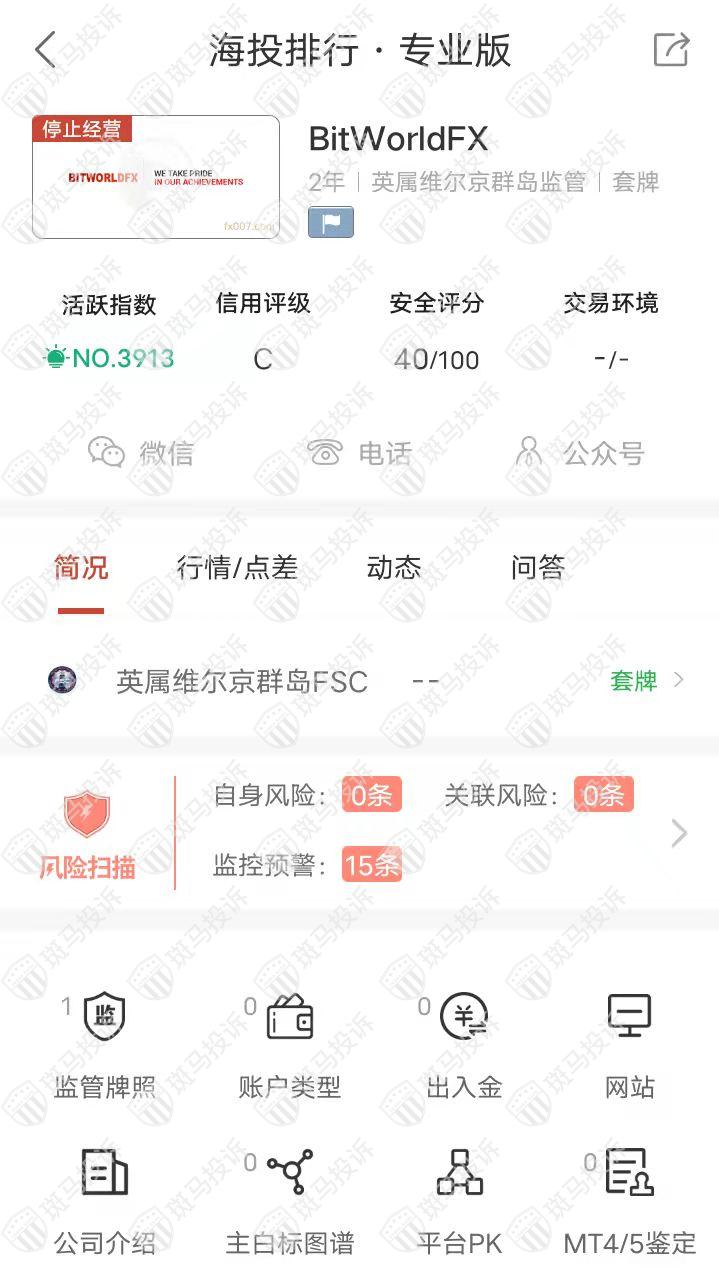 这家平台叫BitWorldFX,成立于2020年,全球排名3913名,目前无监管,但是有存在套牌行为,没有外汇牌照,不能做外汇保证金交易,风险扫描显示15条风险,投资者资金安全无保障。