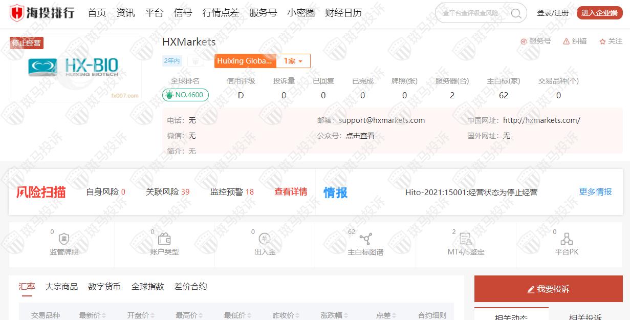 这家平台叫HXMarkets,成立于2020年,全球排名4600名,目前无监管,没有外汇牌照,不能做外汇保证金交易,风险扫描显示56条风险,投资者资金安全无保障。