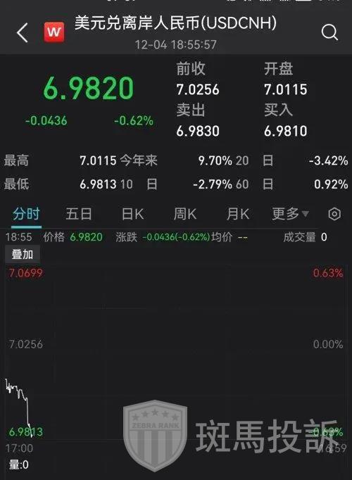截至发稿,离岸人民币报6.9746,从阶段高点算起,一个月时间已涨超3500基点。