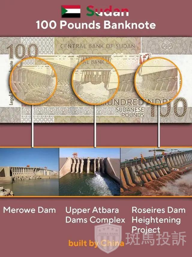 ↑苏丹面额100苏丹镑纸币——麦洛维大坝、上阿特巴拉水利枢纽和罗赛雷斯大坝。