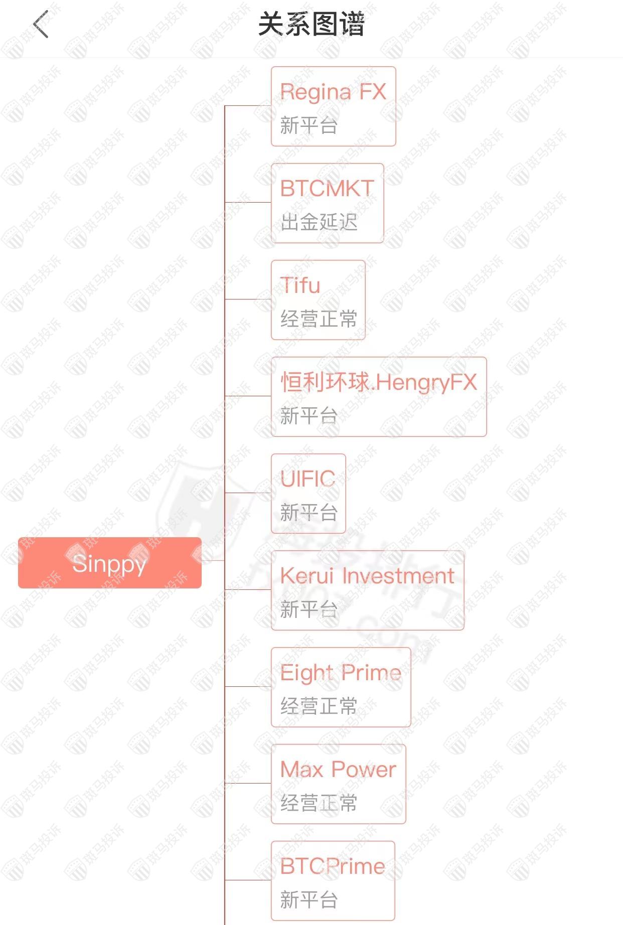 主白标关系显示,Sinppy平台和45家平台存在关联,其中2家平台存在出金延迟的情况,1家平台存在虚假宣传,以及3家平台出现经验异常的情况。